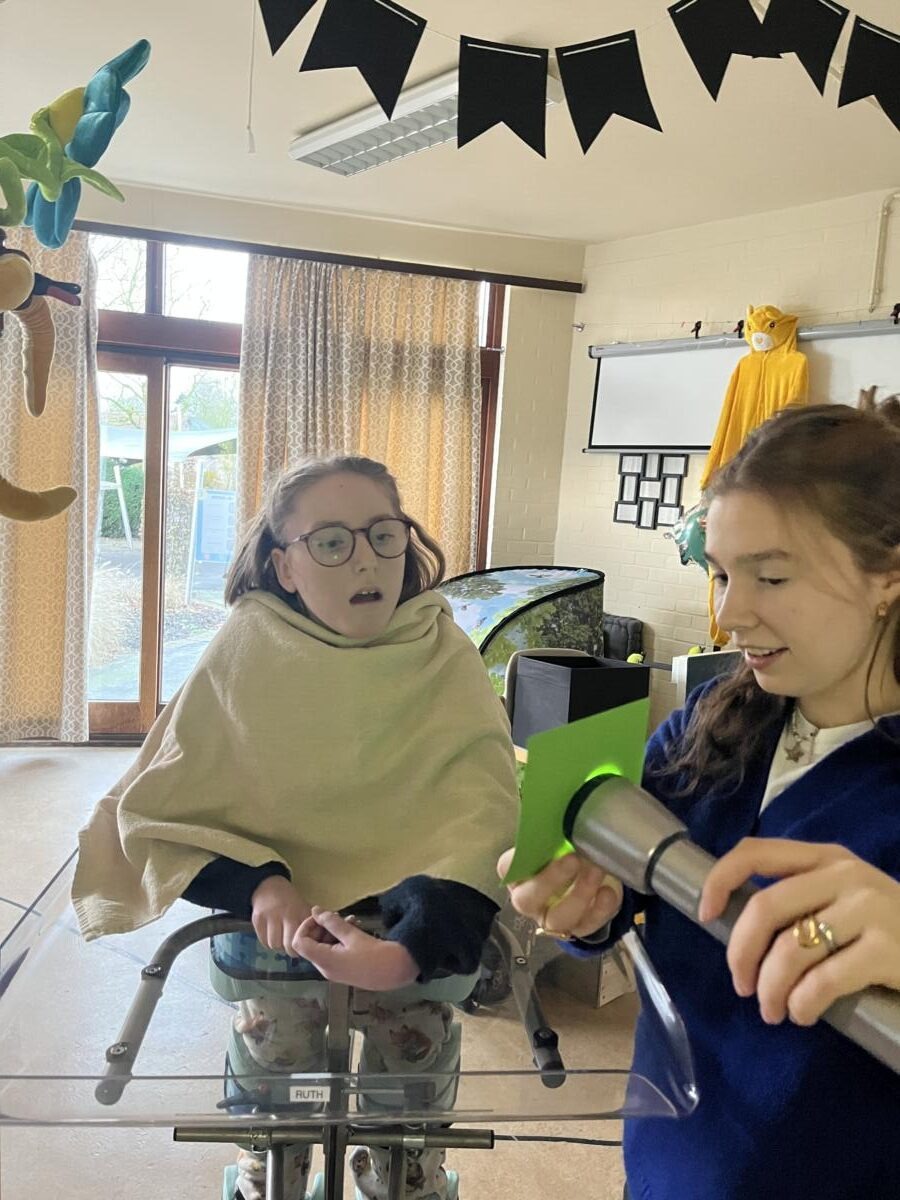 Eens Maxime is gaan we naar de gang voor nog een fietsmomentje voor Diethe & Emma. Steven ligt op de mat en is het doel waar ze naartoe moeten stappen samen met Ruth. Af en toe wordt hij wel eens door de gang gezwierd om hem te verleggen en wordt Ruth verplaatst.