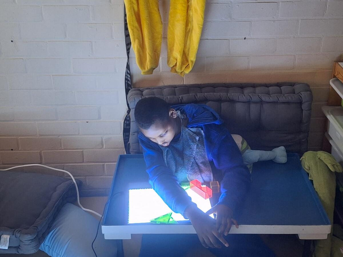 In de namiddag installeren we ons op de matten in de klas, tijd voor een visueel & snoezelmomentje. We nemen er eerst de lichttafels bij en spelen met de blokken en magneten. We sluiten op het einde af met een verhaaltje.
