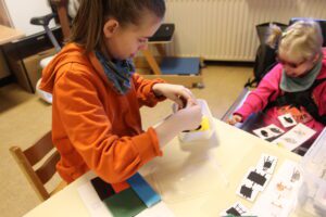 In de namiddag is het tijd voor de bib. We scannen & sorteren de boekjes eerst in de klas, want met z’n allen in de bib is een beetje druk. Wanneer alles gescand & gesorteerd is brengen Diethe, Mackenzie, Hava Nur & Elisa de boekjes naar de bib om ze terug in de kast te stoppen.