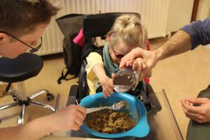 Na de middagpauze is het tijd om nog een beetje te koken. We maken vandaag chocoladecookies. Eerst kijken we naar het filmpje om te zien wat we allemaal moeten doen. Daarna verzamelen we alle ingrediënten, iedereen mag om beurt kiezen wat hij wil klaarleggen of halen. Dan nemen we er de materialen bij en kunnen we beginnen. Eerst suiker, bloem & boter afwegen en dan volgen we het stappenplan. Tussendoor een beetje onnozel doen met onze nieuwe eiersplitser, in de vorm van een varkentje. Vandaag niet kunnen testen of hij de eitjes goed splitst, maar het blijft alvast goed op de wangen hangen 🙂