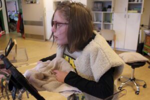 We maken het gezellig (met de lichtprojector) en donker in de klas voor een leuk voorleesmomentje. Zubeyr, Mackenzie, Hava Nur en Elisa placeren zich op onze mattenhoek. Diethe & Ruth zijn wat later en blijven in de rolwagen, zij mogen de volgende keer op de mat liggen. We vertellen enkele verhaaltjes met als thema ‘Egel’.