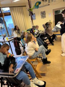 De muziekles begon rustig. Joris speelde op de piano en we zongen er een nieuwe melodie op. Daarna luisterden we naar het lied waar die nieuwe melodie vandaan komt: uit ‘Red & Black light’ van Ibrahim Maalouf. We leerden ook een nieuw lied met het STOP-verkeersbord. Het is een kort liedje waarbij je op het juiste moment het stop-bord omhoog moet steken. Dat is even oefenen, maar het lukte.
