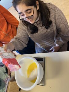 Na de middag koken we met ons nieuw ingrediënt: chocolade!! We maken chocomousse vandaag. Alle ingrediënten verzamelen & tellen/ afwegen. Zodat we eraan kunnen beginnen. Eieren splitsen, chocolade smelten, eigeel mixen, eiwit mixen… Alles geleidelijk aan onder elkaar mengen en dan in potjes gieten. Alles moet nog in de frigo dus proeven zal voor morgen zijn.